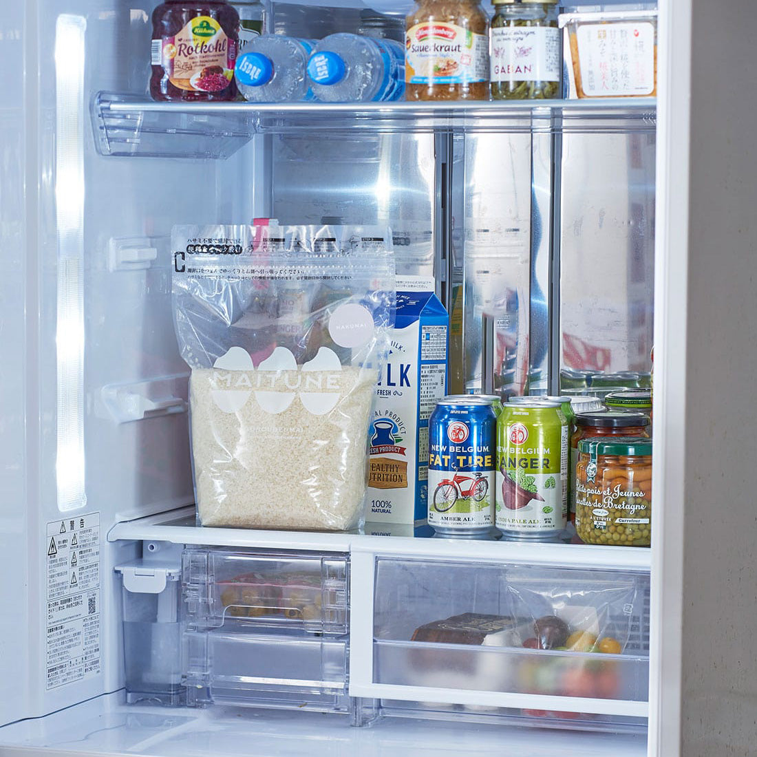 高さを抑えた袋は冷蔵庫の中にもいれやすいため、お米をおいしい状態で保存しやすくなっています。